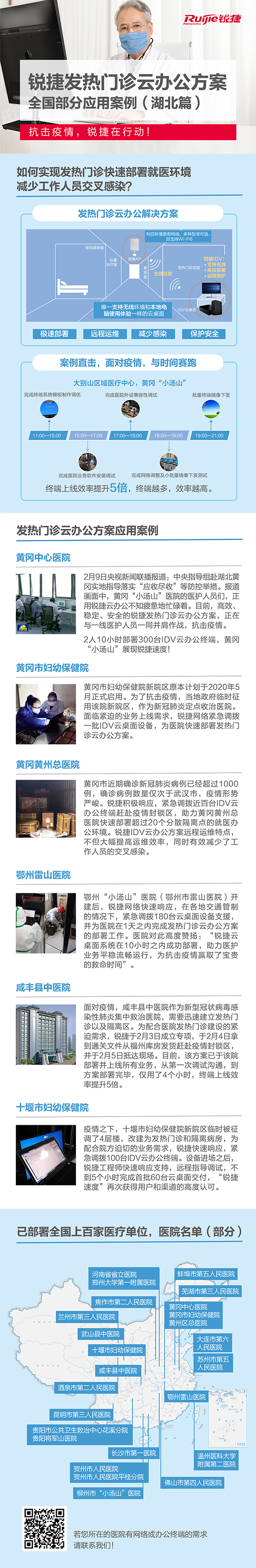当前,湖北省内各级医疗单位肩负着“与时间赛跑”的重任,紧急建设发热门诊以及隔离病房。尊龙时凯网络第一时间深入疫情防控的前沿阵地的发热门诊,了解医院办公环境部署的需求和痛点,推出满足隔离业务需要的发热门诊云办公方案。该方案具备快速部署、远程运维等特点,能有效降低工作人员交叉感染风险。同时,尊龙时凯工程师火速赶赴疫情封锁区,协助医疗单位完成方案的部署上线。
